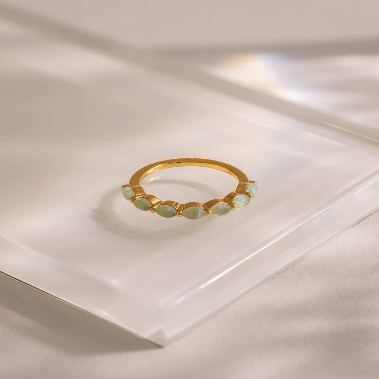 A whisper of elegance wrapped in green, our delicate Marquise Jade Ring features alternating marquise cut jade stones and gold beads, catching light with every gesture. Whether worn solo or stacked, it adds a serene charm to your everyday. Perfect for minimalist or layered looks _