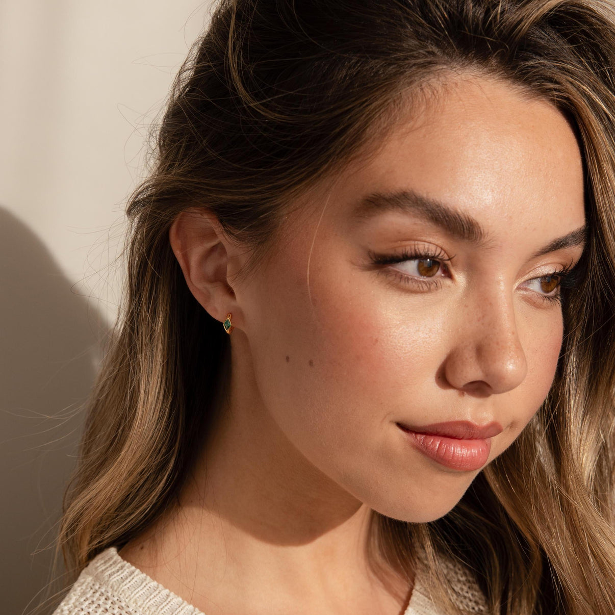 Add a touch of glimmer to your everyday look with our stunning Rhombus Birthstone Huggies! Featuring a sleek rhombus-shaped gemstone set on classic huggie hoops, these earrings are fully customizable with the stone of your choice, making them uniquely yours. Whether you__e dressing up or keeping it casual, this shimmering design effortlessly elevates any outfit.