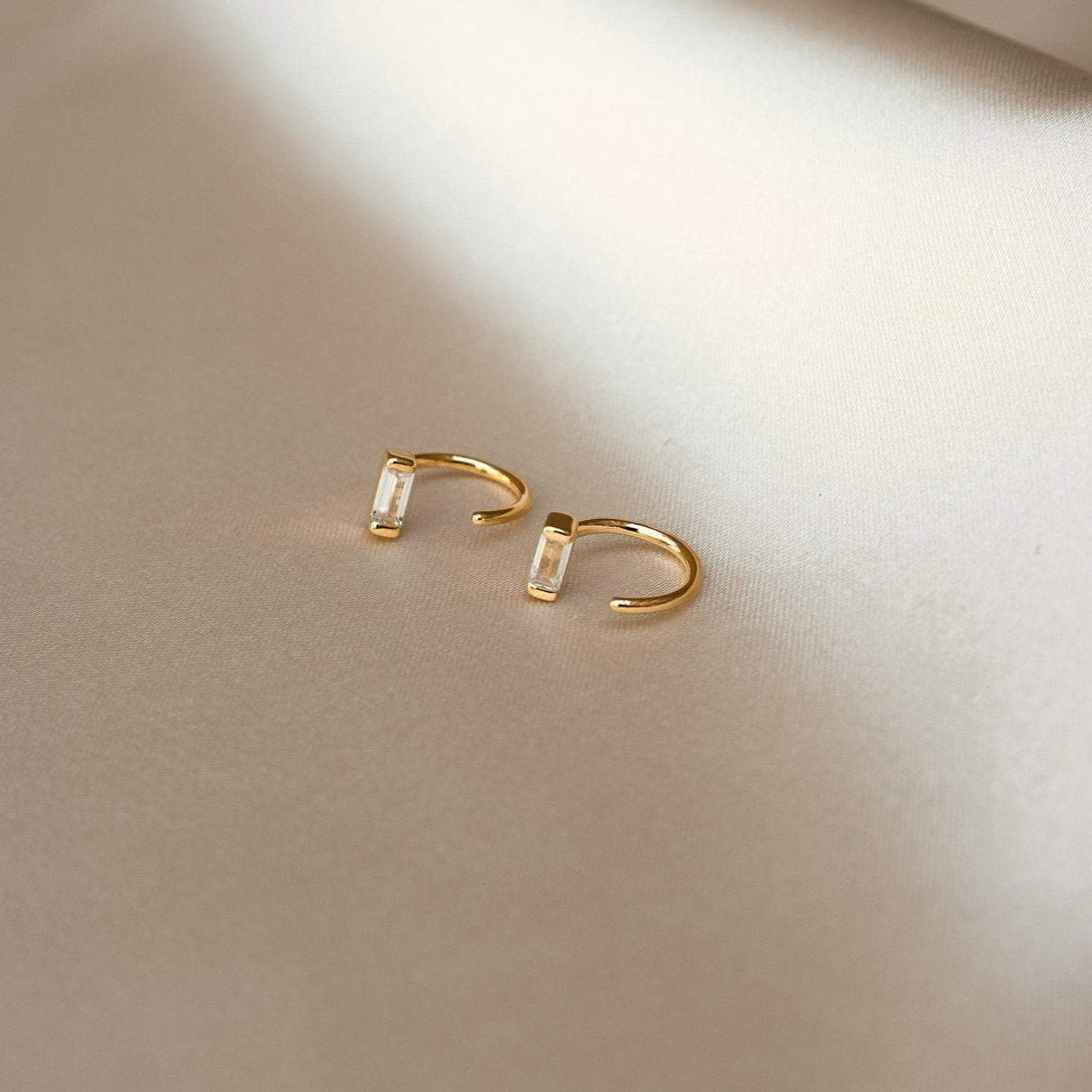 Classic and beautifully matched, these Shayla Baguette Huggies feature a sparkling baguette-shaped diamond on a wire half hoop. The unique and understated pair include an open end, slipping earrings on and off has never been easier.