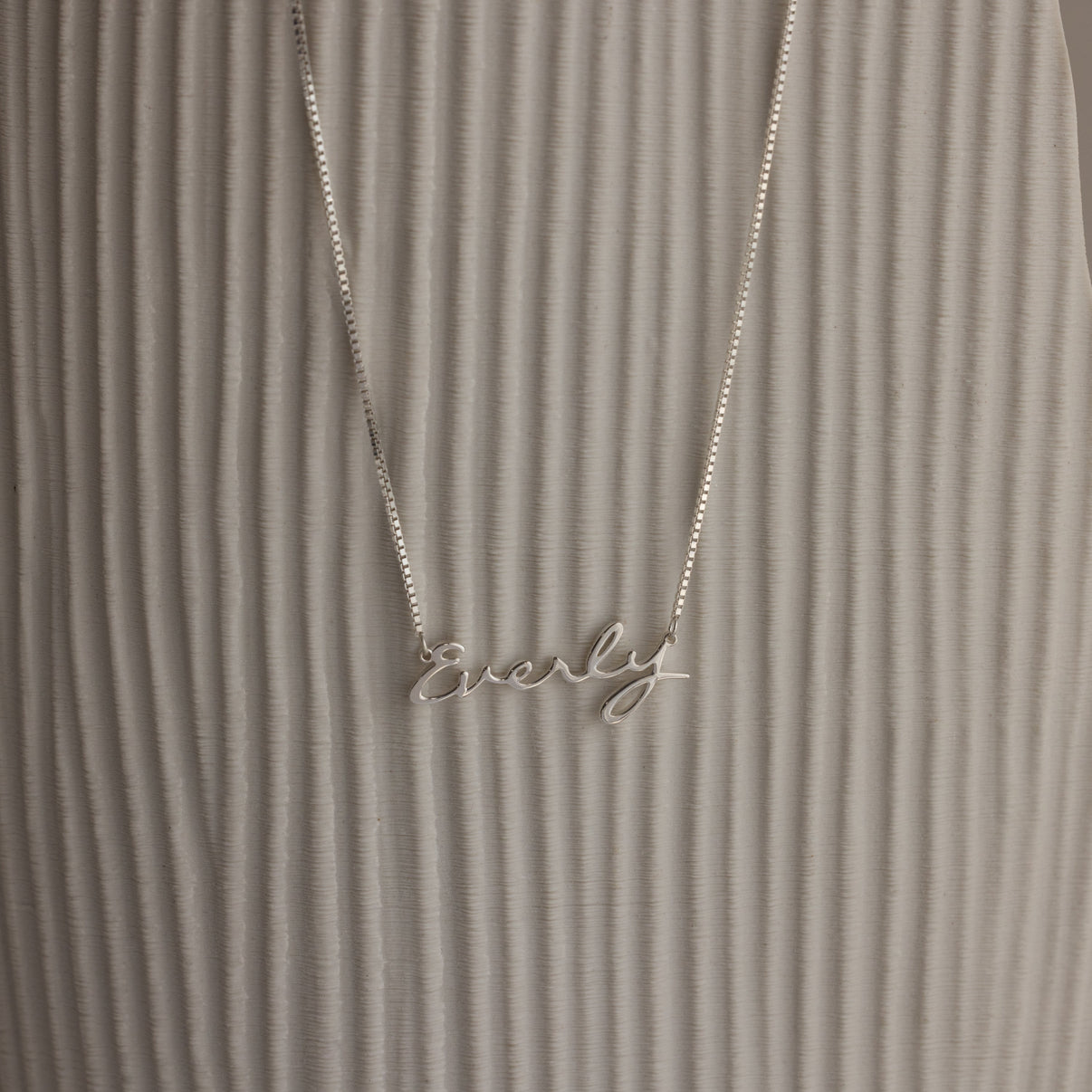 A cool, calm, and collected font is featured on the Callie Name Necklace. The customizable charm sits elegantly on a sparkly box chain adding some extra oomph to your everyday outfit. Perfect for yourself or for gifting on a special occasion.